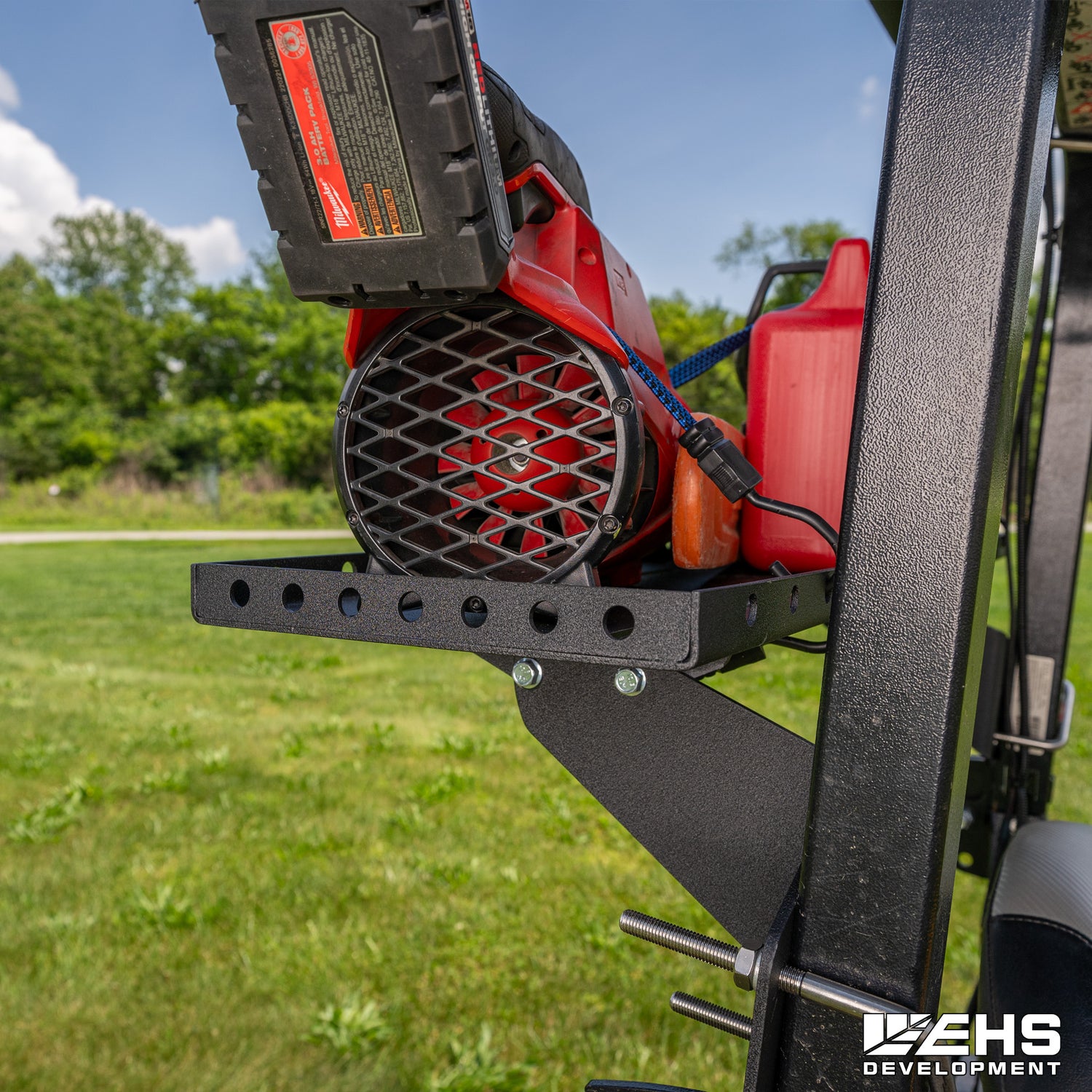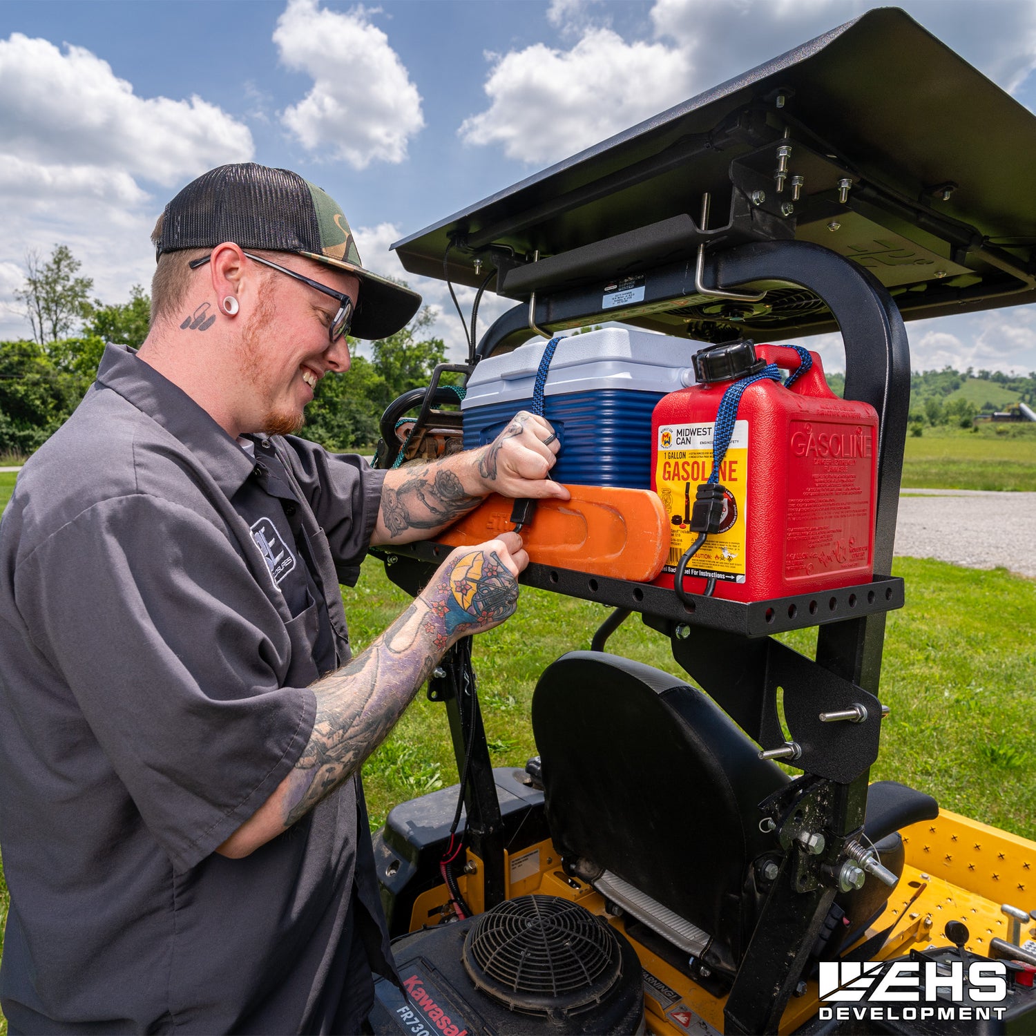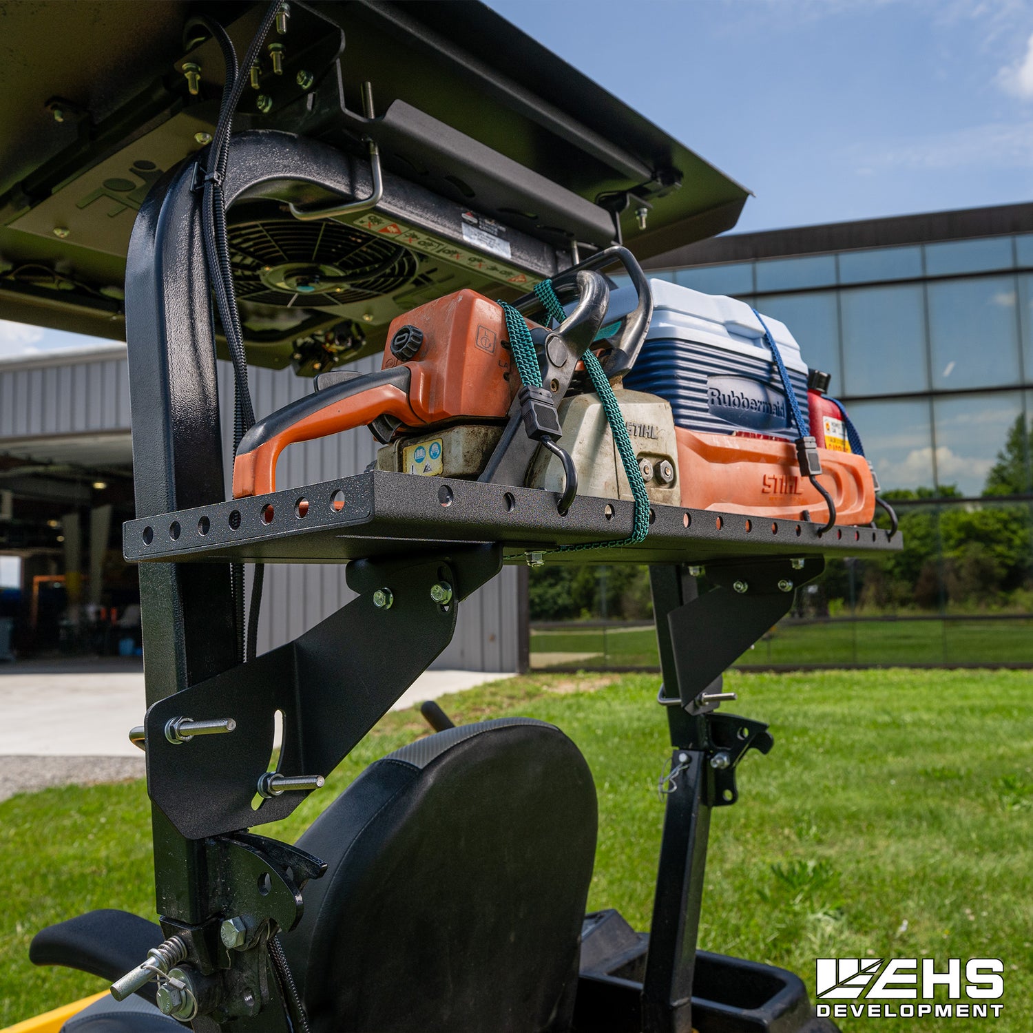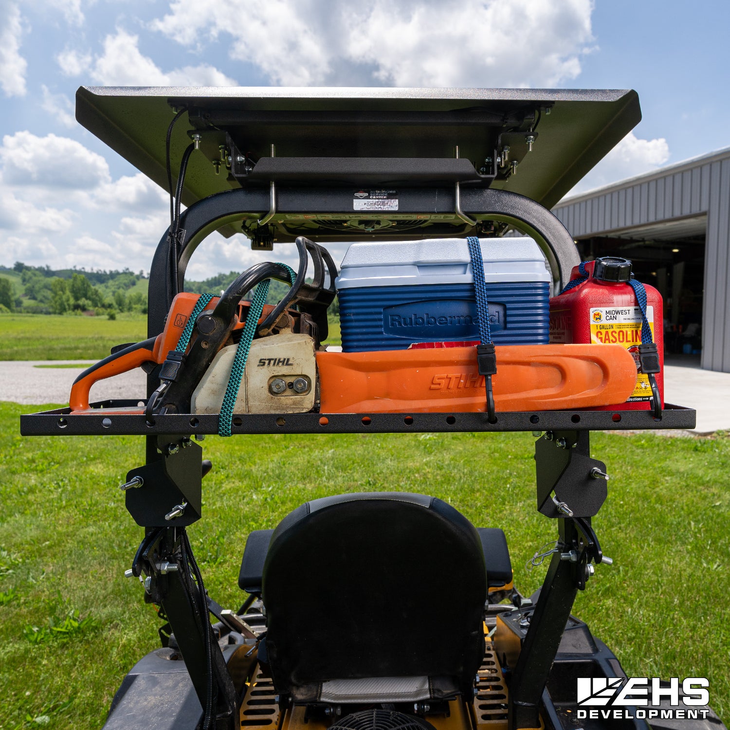 Grab everything you need before you head out to mow—cooler for refreshments, leaf blower, and hedge trimmers. But where are you going to store them? Install EHS Development's Universal Zero-Turn E-Series ROPS Cargo Rack. It gives you the convenience of transporting and storing all the tools you need to manicure your lawn without making multiple trips back to the barn.